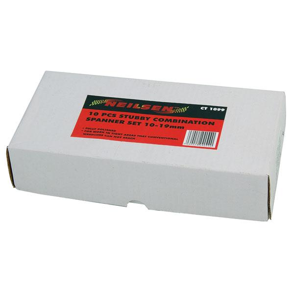 10pc stubby combination spanner set with satin finish, sizes 10–19mm.