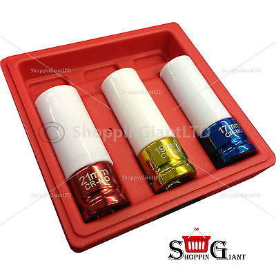 3 Pc 1/2" Drive Sockets Deep Thin Wall Alloy Coloured Cr Mo Wheel Garage CT0920