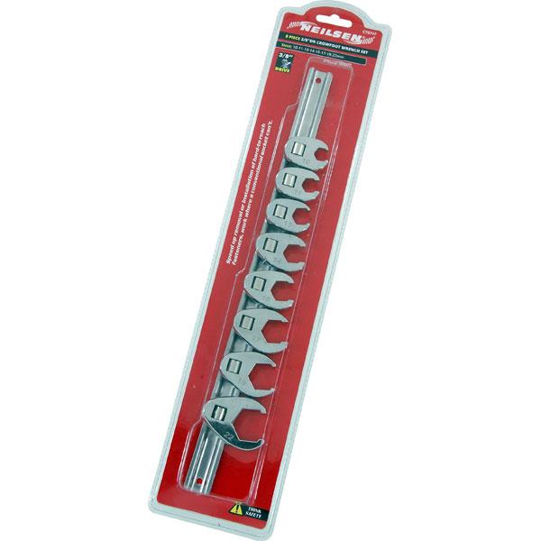 - 8-piece 3/8" drive crowfoot wrench set for accessing hard-to-reach fasteners.